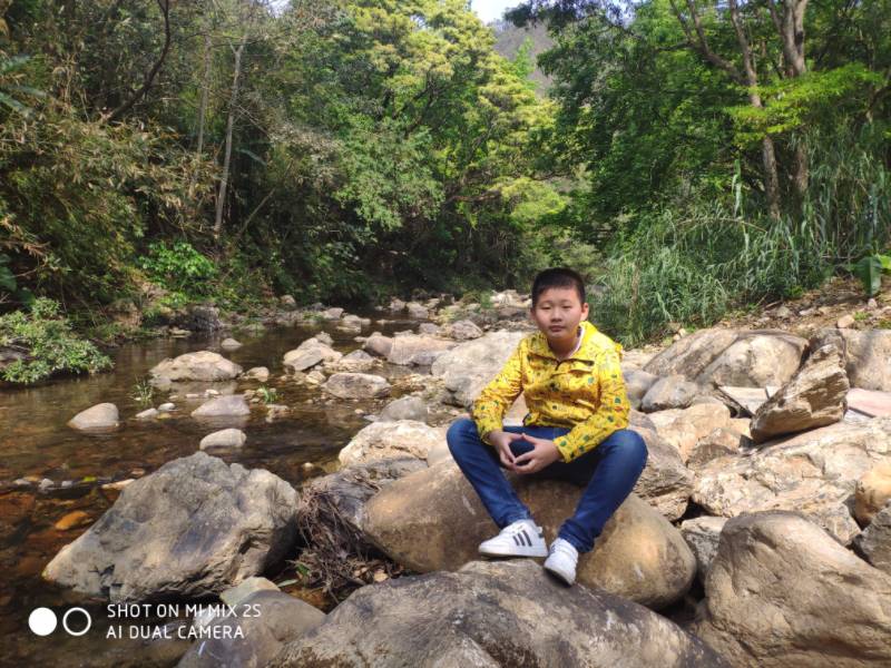 儿子喜欢在山涧的河床上玩耍